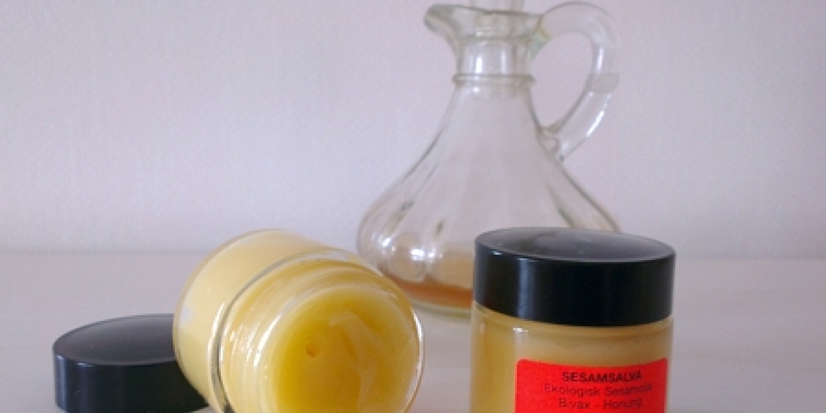 I sesamoljan som ingår i den här salvan finns de naturliga antioxidanterna sesamol och sesamin. Oljan är halvfet och absorberas fint och innehåller även naturligt solskydd. Den passar bra till mogen hud, som nattkräm, vid torra eksem och nagel-bandsproblem. Den är även värd att prövas vid psoriasis och annan problemhy.